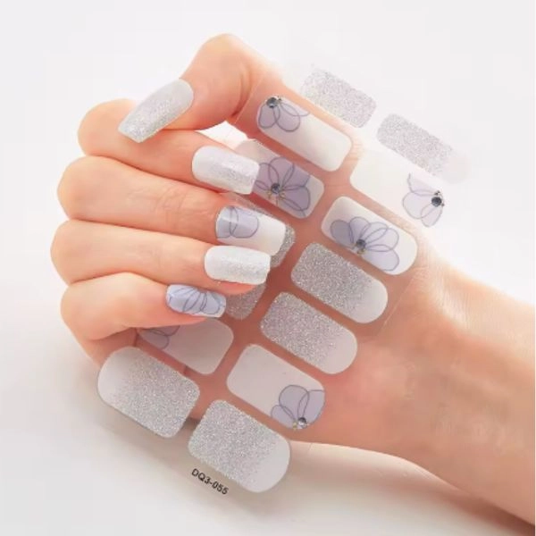 Popolnoma prekrivne nalepke za nohte, svetlo zeleni z rožicami in bleščicami.