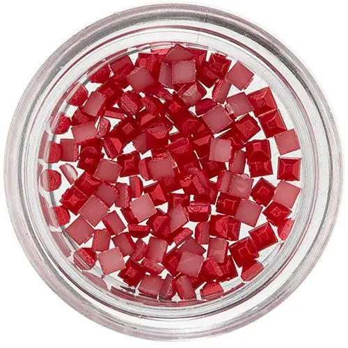 Izvirni okraski za nohte v obliki kvadratkov rdeče barve z bisernatim sijajem. Odlični so za okraševanje naravnih in tudi umetnih nohtov. Za lažje nanašanje je priporočljiva uporaba manikirne palčke.