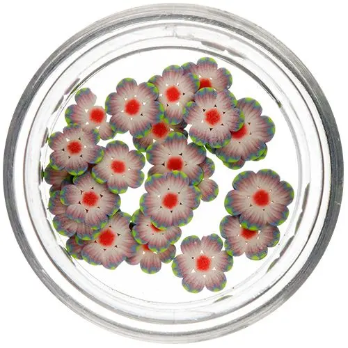 Dekoracija za nohte iz fimo mase v obliki rožic belo-vijolično-neonsko zelene barve z oranžno-rdečim jedrom.